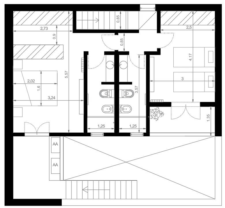 Planta Alta (Sector Privado): Se desarrolla la zona de descanso más exclusiva, destacando la suite principal con vestidor y baño privado, junto a un tercer dormitorio con balcón y un baño completo adicional.